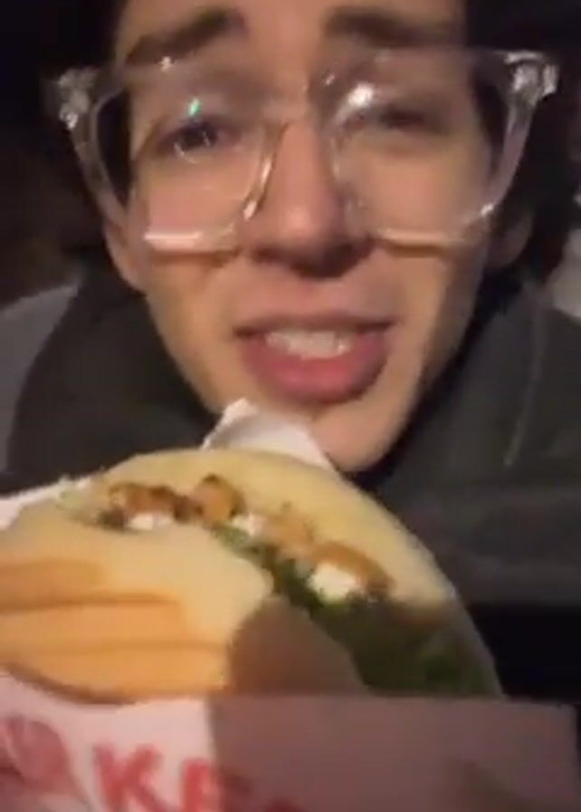 A young man with clear, oversized glasses holds a partially eaten kebab in a paper wrapper that says "Keba" and exclaims "A kebab to finish Sunday recovery. Fuck yeah." The man's face is close to the camera. He is outside at night. A brick wall is partially visible in the background.