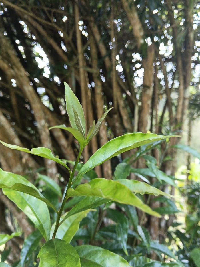 The image depicts a close-up of a leafy green plant situated outdoors in Masulog, Philippines. The primary subject is a slender, green-stemmed plant with numerous bright to medium green leaves, featuring a cluster of lighter green new growth at its apex. The leaves are generally ovate-lanceolate with visible venation. Several small, clear water droplets are present on some leaf surfaces in the lower foreground. The background is heavily out of focus, rendering vertical brown and dark green elements consistent with tree trunks or dense foliage. Multiple bright, circular bokeh effects are visible, indicating sunlight filtering through an overhead canopy. No human figures, animals, or man-made structures are discernible within the frame. The scene is illuminated by natural daylight.