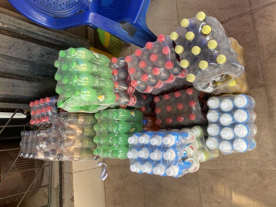 The image displays a ground-level view of numerous commercially packaged beverages stacked on a light brown tiled floor within a commercial or storage area in Okura, Nigeria