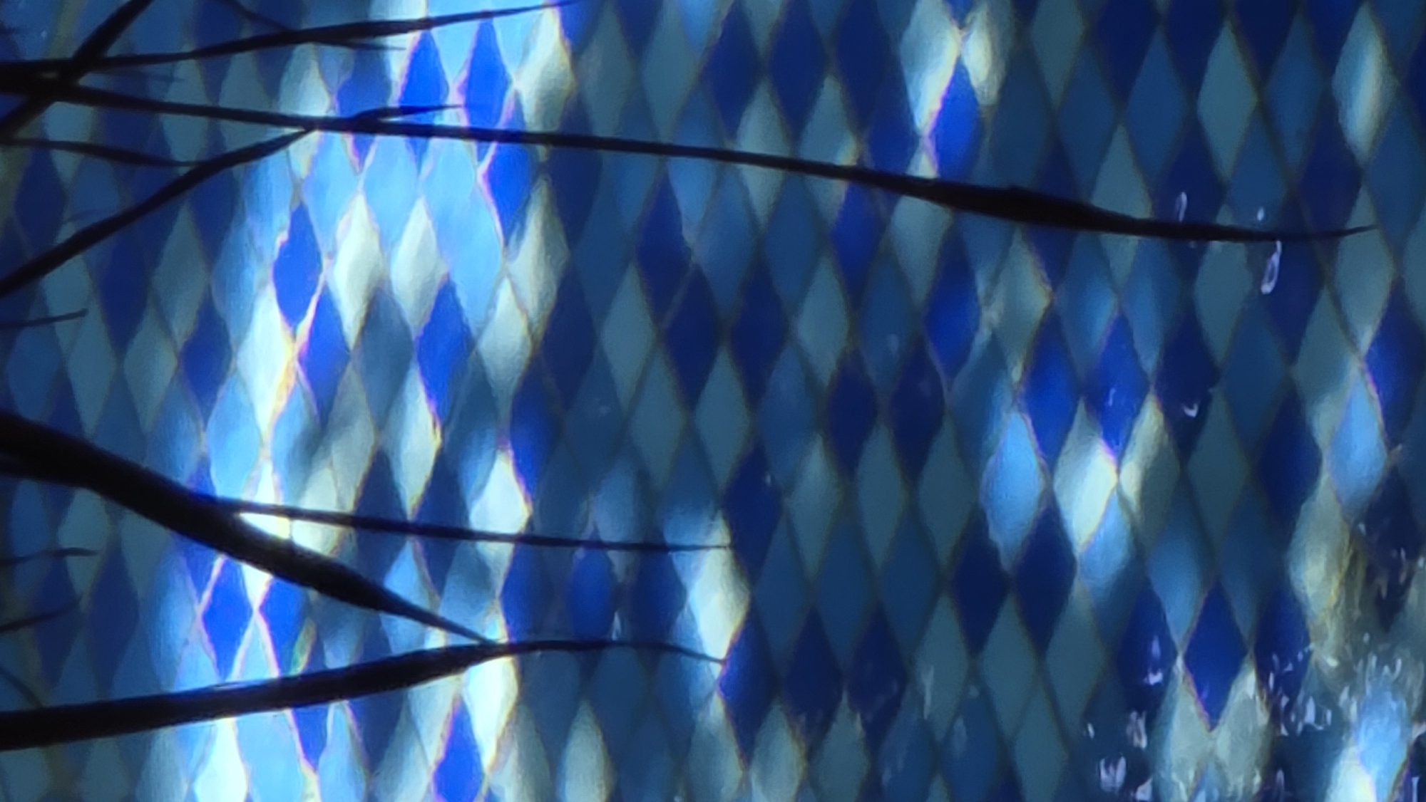 blue diamond-patterned surface, possibly tiles or a wall, partially obscured by dark, thin, branch-like structures. Some areas on the diamond pattern have a slight iridescence. There are small, blurry white specks to the bottom-right, which could be bubbles in water. There are no people visible. The location and context are unknown.
