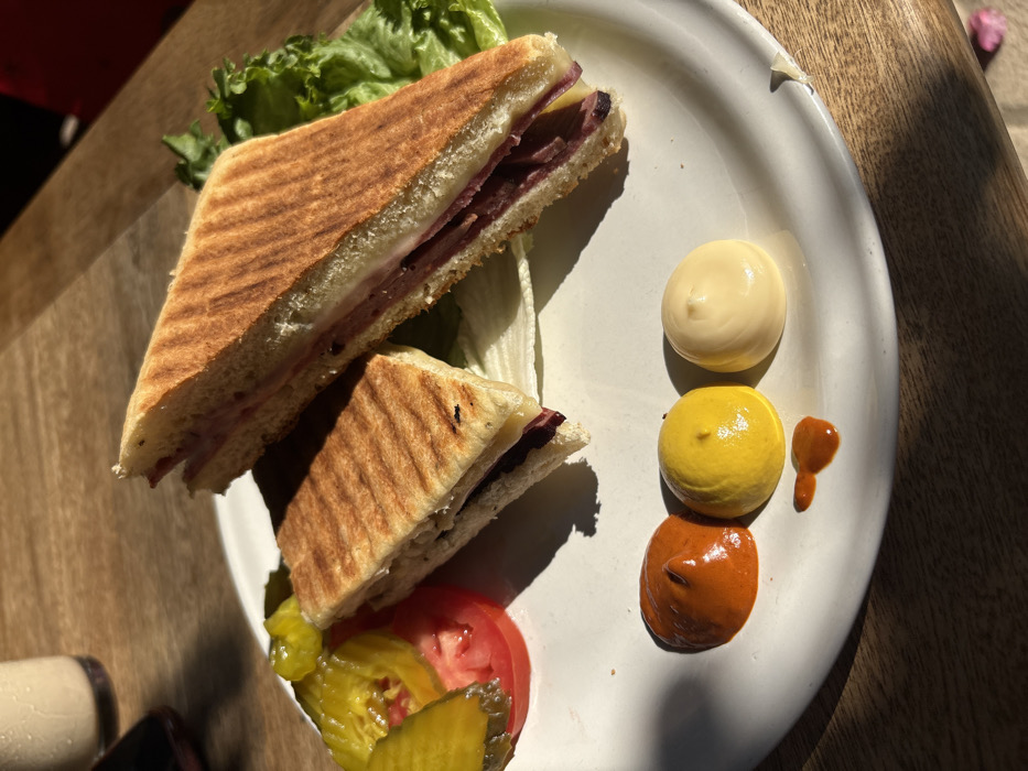 - "A halved, grilled sandwich sits on a white plate with lettuce, tomato, and pickles" by FM-TOclH2, licensed under CC BY 4.0