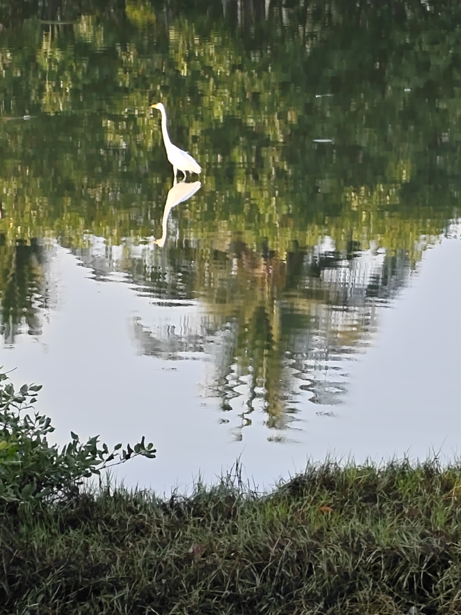 An egret stands in shallow water within a natural environment in Lhokseumawe, Indonesia. The bird, positioned centrally, is white with a long neck and a yellow beak, facing left with its head slightly angled downward. Its reflection is visible directly below it on the water's surface, showing minor distortion due to ripples. The water occupies the majority of the upper two-thirds of the image, reflecting dense green foliage from trees or shrubs along the far bank, creating an abstract pattern of green, yellow-green, and darker tones with vertical streaks. The foreground displays the near bank, covered in a mix of green and dry brown grasses, with a cluster of dark green leafy vegetation visible on the lower left. No human subjects or man-made structures are apparent.