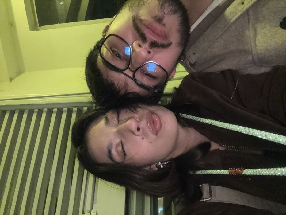 A man and a woman are closely posed together. The man has a beard and wears glasses. The woman has her eyes closed and is wearing a brown jacket with a sparkly lanyard. They appear to be indoors, against a background with vertical lines suggesting window blinds or a similar structure. The overall lighting gives the photo a slightly yellow tint.