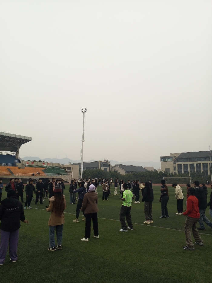 A group of people stands on a green field, seemingly engaged in an activity. Buildings and a stadium with orange seating are in the background. A tall light pole stretches into the overcast sky. Most people are dressed in casual clothing, with various colors and styles represented. The atmosphere suggests a school or recreational setting.