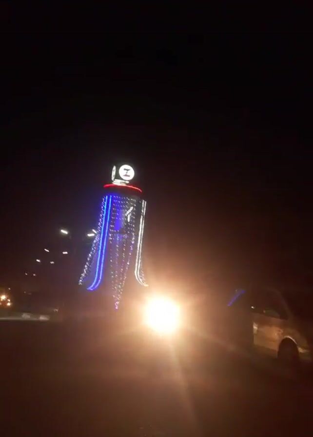 clock tower at night. The tower has blue and white lights strung around it. The Z logo is displayed on top. Cars are driving by on the street in front of the tower.