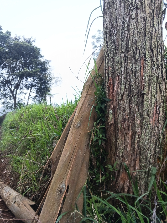 The image captures an outdoor natural environment in Pinnwe, Myanmar (Burma), under an overcast sky. A large tree trunk with deeply fissured, brown and grey bark dominates the right side of the frame. Leaning against the left side of this trunk is a decaying, reddish-brown wooden plank or log, roughly 1.5 meters in length, exhibiting exposed wood grain and a visible knot. Below this plank, a smaller, lighter-colored piece of wood rests on the ground. To the left of the leaning wood, an incline of dense green grass and various plants covers the terrain, extending towards the midground. In the far background on the left, several trees with dark green foliage are partially visible against a bright, uniformly white sky. No individuals, animals, or man-made structures are depicted in the scene.