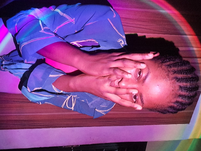 A person lies down, covering their face with hands. They have dark, braided hair and wear a blue patterned shirt. The room is lit with colorful lights, including a rainbow effect on the right. The person rests on a wooden surface with a lighter pink area visible below. The lighting creates a dramatic and slightly surreal atmosphere.