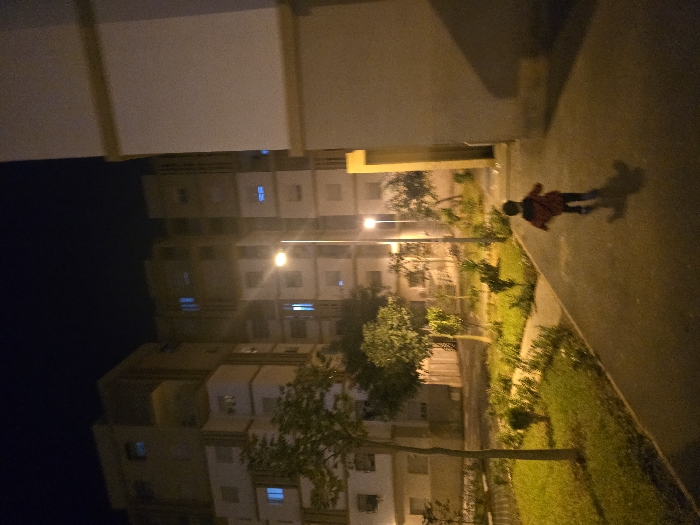 A nighttime scene features an apartment building illuminated by streetlights. A child, presumably running, is visible on the sidewalk with a pronounced shadow. Green grass and young trees line the path between the sidewalk and building. Some windows in the building have visible lights. The overall ambiance is dark, yet lit by the streetlights.