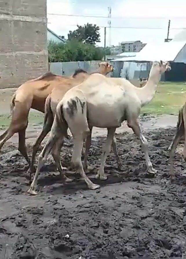 A boy with a stick herds four camels through a muddy area with buildings in the background. The camels are various shades of brown and off-white. The ground is covered in dark mud. The boy is on the left side of the frame, moving toward the right, urging the camels forward. The buildings in the background are a mix of concrete and metal structures. A sign for a church is visible on one of the buildings. The sky is overcast.