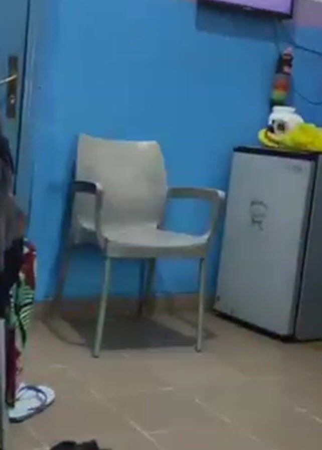 n indoor scene of what appears to be a waiting room in a hospital or clinic. The walls are painted in blue and white, with a horizontal purple stripe. A woman wearing a patterned dress and slippers is seated in the lower left corner, partially obscured by the camera's perspective. In the center of the frame, there's an empty light grey plastic chair. To the right of the chair, a small silver refrigerator stands against the wall. A television is mounted on the wall above the refrigerator, displaying a show. The floor is tiled in a neutral color. Other objects include a bed with a patient to the right, a sign posted on a door to the left, and various items on top of the refrigerator. The lighting is artificial and appears to be from overhead fixtures.