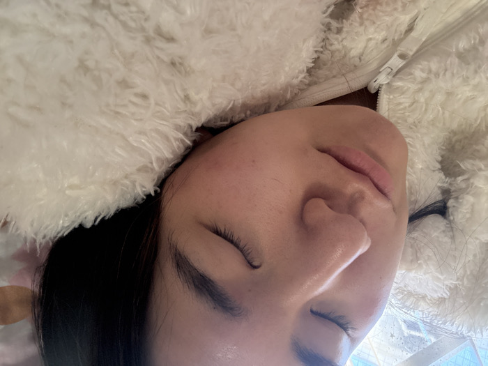 A close-up image shows a person lying down, presumably sleeping. The subject's face is the primary focus, with closed eyes and relaxed features. Soft, fluffy material, likely from a blanket or jacket, surrounds their head. Dark hair is visible against the light-colored bedding. The image captures a moment of rest or tranquility. The composition is simple, highlighting the subject's peaceful expression.