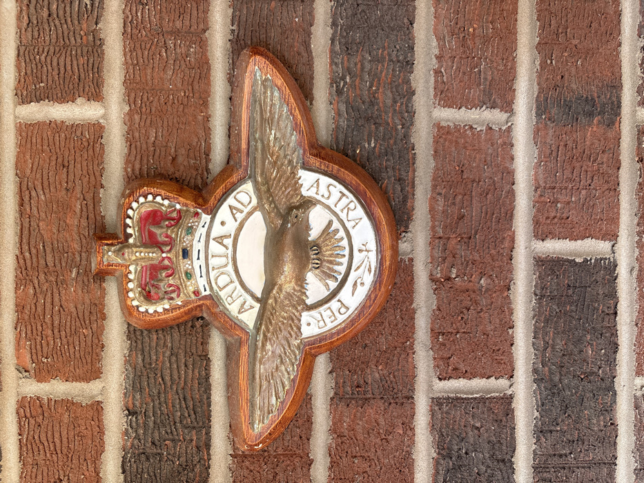 A Royal Air Force (RAF) crest is affixed to a textured red brick wall in Pulverbatch, United Kingdom