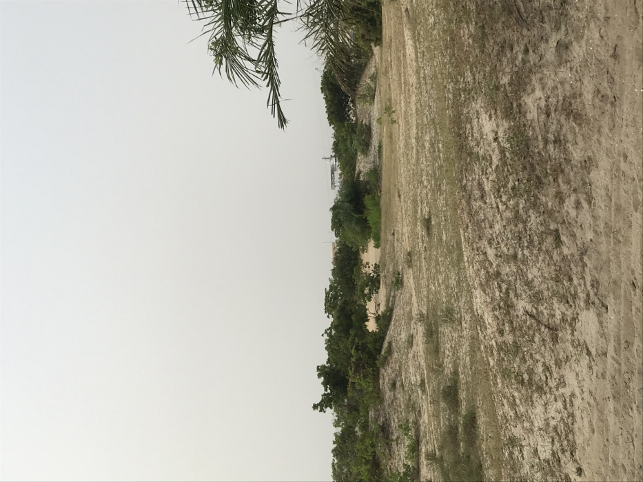 A sideways view presents a sandy landscape dominated by a light, overcast sky. Green foliage lines the horizon, indicating vegetation or trees. A palm frond hangs in the upper left. A distant structure, possibly a building or tower, is faintly visible amidst the greenery. The foreground exhibits sandy terrain mixed with sparse vegetation, suggesting a coastal or arid environment.