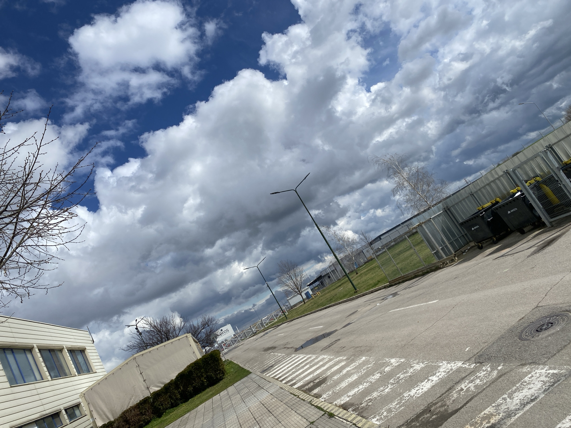 - "The image depicts an outdoor industrial or commercial area in Ruse, Bulgaria, under a sky with prominent white and dark grey cumulus clouds contrasting with patches of deep blue" by FM-xoHO02, licensed under CC BY 4.0