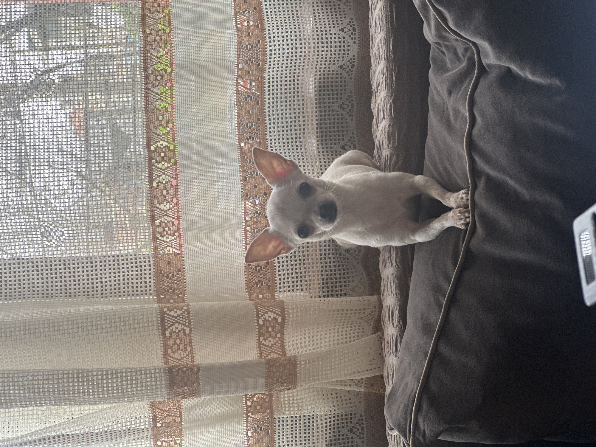 The image displays an indoor scene within a residence in Skala, Bulgaria. A small, white, short-haired dog, resembling a Chihuahua, is positioned centrally, sitting upright on a dark gray pet bed. The dog faces directly towards the viewer, with its front paws together and ears erect. The pet bed has a visible light brown piped edge. Behind the dog, a window is evident, covered by two layers of sheer curtains. The inner curtain is a white, fine-mesh fabric, while the outer or integrated layer features horizontal bands of light brown lace-like material with intricate geometric and floral patterns. Through the translucent curtains, a blurred outdoor environment is visible, suggesting trees and indistinct structures under daylight. In the lower-left foreground, a small, out-of-focus portion of a light-colored electronic device, possibly a remote control, is partially visible. No people are present.