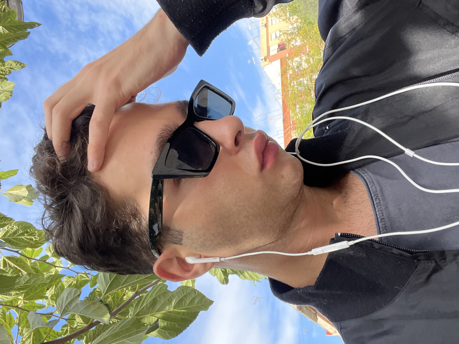 A young adult male is depicted in a close-up outdoor portrait, facing slightly to his left. He has dark, wavy hair and is wearing black, angular-frame sunglasses, along with white wired earphones in both ears. His right hand is raised with fingers splayed, touching his hair above his right temple. He is dressed in a black collared jacket worn over a dark grey t-shirt. The background features a clear blue sky with minimal white clouds, green tree leaves visible in the upper left, and sunlit residential buildings with reddish-brown tiled roofs in the mid-ground. The scene is located within the city of Torrent, Spain.