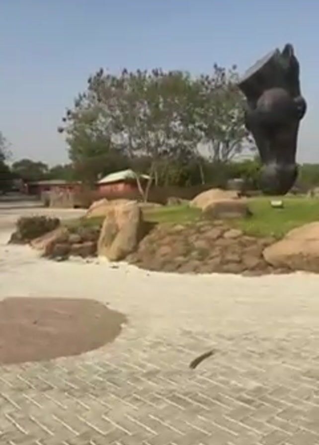 statue of a horse's head. The statue is brown and set on a base made of rocks and green grass. Behind the statue are a few trees and some red buildings. The ground is paved with grey bricks in a herringbone pattern. The sky is clear and blue. A voice can be heard in the video.