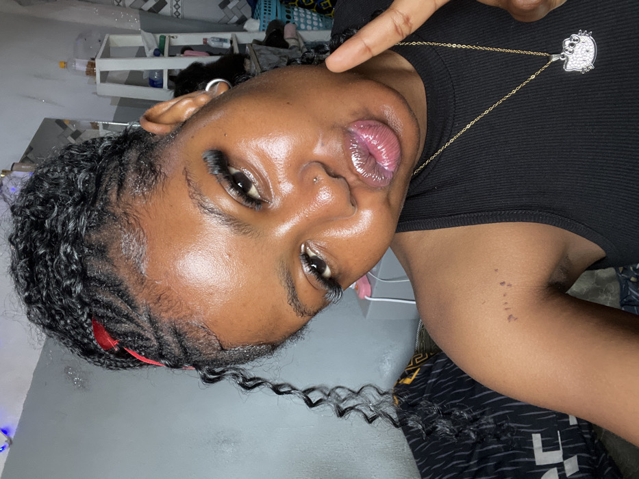 A close-up photograph depicts a dark-complexioned female subject indoors, reportedly in Asipa, Nigeria. The subject, angled slightly to the left, looks directly at the viewer with a pouting expression, her lips glossy. She exhibits long false eyelashes, a nose piercing in her left nostril, and a silver hoop earring in her right ear. Her black hair is styled in braids, with some strands loose and curly, and a red ribbon visible near the top left of her forehead. She wears a black ribbed sleeveless tank top and a gold necklace with a silver, rhinestone-encrusted Hello Kitty pendant. Her right hand is raised to chest level, with the index and middle fingers extended in a "V" shape. Faint, dark, irregular marks are visible on her upper left arm. The background consists of a light grey wall; to the left, a dark patterned fabric with white shapes is partially visible, while to the right, a white multi-tiered shelving unit holds various bottles and objects. Blue string lights are visible along the top left edge of the frame.