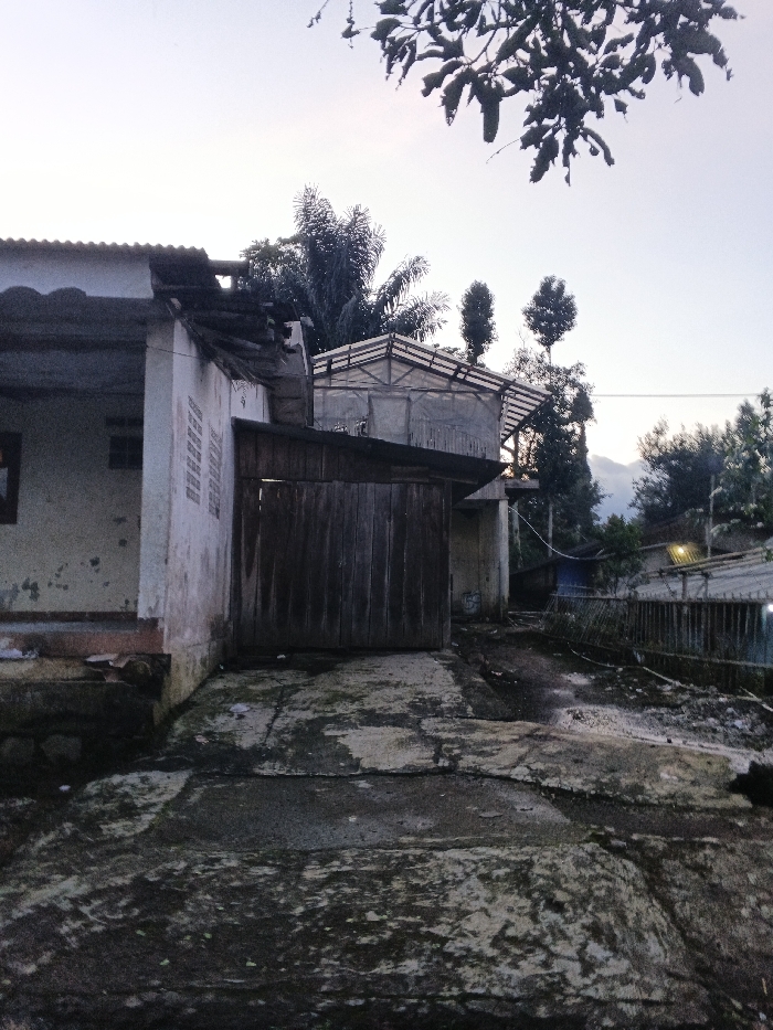 The image depicts an outdoor residential scene in the city of Unknown, Uruguay, under pale, muted lighting conditions, suggesting either early morning or late evening. The foreground features an uneven concrete and dirt surface, displaying cracks, moss, and significant discoloration. To the left, a weathered, single-story building with a corrugated metal roof is visible. Its light-colored exterior shows peeling paint and staining. A rectangular window is present on the building's left side, above a visible concrete or stone foundation. Adjacent to this building, a closed, dark wooden gate, constructed from vertical planks, stands beneath a small, sloped roof extension. Beyond the gate, the ground transitions to an unpaved area. In the midground and background, a structure with a translucent, possibly plastic or sheeting, roof supported by a framework is evident. Various trees, including tall, slender varieties and denser foliage, punctuate the landscape. A single utility wire is visible traversing the mid-distance. The horizon reveals faint outlines of distant hills or mountains beneath an overcast sky. To the far right, a section of a dilapidated metal fence and scattered debris are present. No people are visible, and no actions or interactions are depicted.