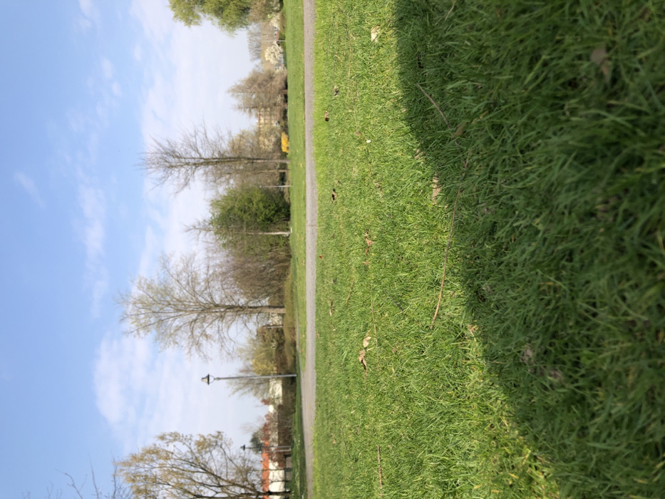 The image depicts a park or green space located in Rodano, Italy, under a clear blue sky with minimal scattered white clouds. The foreground consists of vibrant green grass, closely cropped, with scattered dry leaves and thin twigs visible on its surface. A dark, undefined shadow occupies the lower right portion of the grass. In the midground, a light-colored, unpaved pathway or road traverses horizontally across the scene. To the left of this pathway stands a tall, slender gray street light pole with a dark fixture at its apex. Beyond the pathway, the scene is dominated by a variety of trees and bushes. Some trees appear deciduous with emerging light green leaves, particularly on the left, while others are still bare-branched. Denser clusters of bushes and smaller trees are interspersed throughout. In the background on the left, several buildings with distinct reddish-orange tiled roofs are partially visible behind a line of trees. Further to the right in the distant background, more trees and vegetation are present, along with what appears to be a bright yellow object, possibly a vehicle or construction equipment, behind a line of trees. No individuals or active subjects are discernible in the scene. The overall lighting suggests a sunny daytime setting.