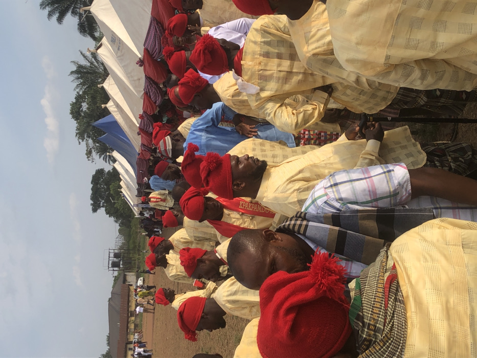 A large group of people, predominantly men, are seated outdoors under white tents. They are wearing red hats and mostly light yellow clothing. Some wear patterned fabric wraps around their shoulders or waists. A few people in the distance stand, and trees and buildings are visible in the background. The scene appears to be a formal gathering or ceremony.