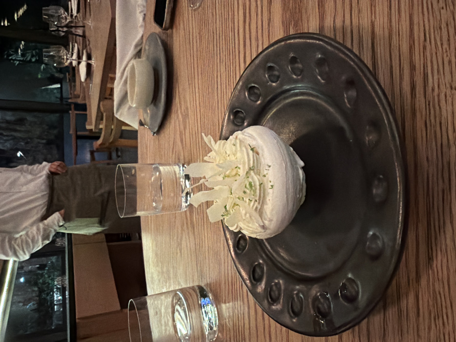 The image depicts an indoor nighttime scene at a high-end restaurant, identified as Pujol, located in Mexico City, Mexico. The central foreground features a white meringue-based dessert, possibly a Pavlova, topped with whipped cream, irregular white chocolate shards, and green lime zest. This dessert rests on a dark, matte-finish round ceramic plate with a pattern of raised circular depressions along its rim. The dessert and plate are positioned on a light-toned wooden table exhibiting a pronounced horizontal grain. To the left of the dessert, a clear glass filled with water is partially visible. To the right, a full, clear glass of water stands further back on the table. Behind these items, a small, light-colored ceramic bowl is placed on a dark, flat plate. A dark-colored smartphone or similar device is partially visible to the right of the bowl. In the background, a person, likely a server, stands to the left, facing right, with hands in pockets. They wear a white long-sleeved shirt and a dark olive-green apron. Behind the server, large windows reveal a dark outdoor environment with discernible foliage. To the far right in the background, another dining table is set with multiple empty wine glasses. The ambient lighting is dim.