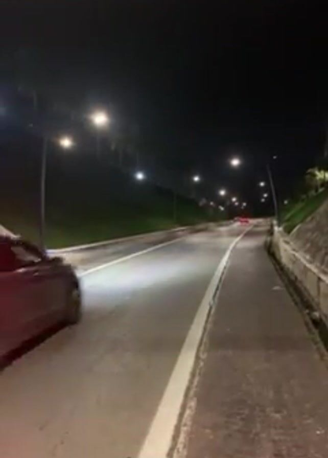 vehicle driving on a paved road at night. The road is lined with streetlights on one side and a short concrete wall on the other. The vehicle, which appears to be a dark-colored sedan, drives towards the camera and then passes by. In the distance, the taillights of another vehicle can be seen. The environment appears to be a residential area or a park, indicated by the landscaped areas flanking the road.