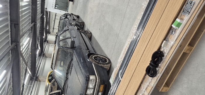 This image depicts the interior of a large, brightly lit industrial or storage facility, likely a garage or warehouse, in Sofia, Bulgaria. The floor is concrete. The ceiling features exposed metal truss work and numerous overhead fluorescent strip lights. Walls in the background are light-colored, with a large white rollup door visible to the far right. In the midground, a dark-colored (possibly navy blue or black) 1980s or early 1990s Audi 80 B3 sedan is parked. The vehicle appears dusty, indicating storage. It has four doors, a visible sunroof, and aftermarket multi-spoke black wheels. Immediately behind this vehicle, another dark-colored sedan is partially visible, also covered in dust. A third vehicle, partially obscured and appearing yellow, is visible further in the background on the left. In the immediate foreground, a wooden pallet rests on the concrete floor. On the pallet, multiple long, narrow panels of light brown, wood-grained material are wrapped in clear plastic sheeting. Placed on top of these wrapped materials are several smaller items: a coiled black rubber strap or cable, various small metal components (including potential brackets or hinges), a small item wrapped in green and white striped tape, and a larger silver-colored metal plate or mechanism, all suggestive of construction or assembly parts. No individuals are present in the scene, and no specific actions or interactions are depicted; the scene is static. The exact location within the city of Sofia, Bulgaria, is not discernible from the visual information provided.