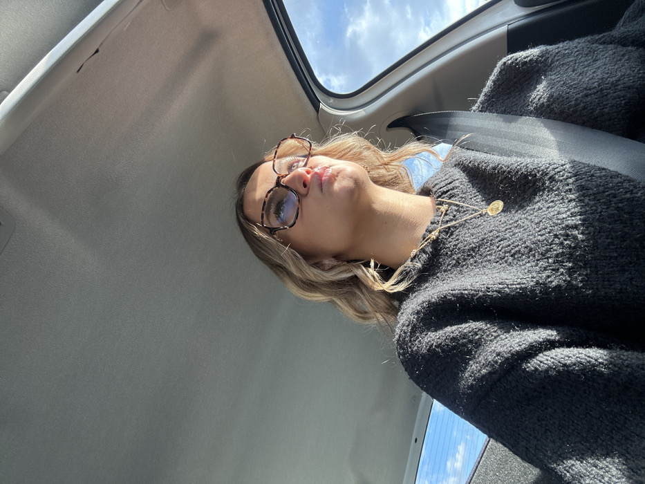 A young adult female is depicted inside a vehicle, located in Chantemerle-les-Blés, France. She is seated and secured by a dark gray seatbelt extending diagonally across her chest. She wears a dark gray knit sweater and two layered gold chain necklaces, one featuring a circular medallion pendant. Her hair is blonde and styled in waves. She wears large, square, tortoiseshell-patterned eyeglasses that reflect ambient light. Her lips are pursed, and she directs her gaze upwards and to her right. Strong direct sunlight illuminates the right side of her face. The vehicle's interior features a light gray headliner. Through the windows, a bright blue sky with scattered white clouds is visible.