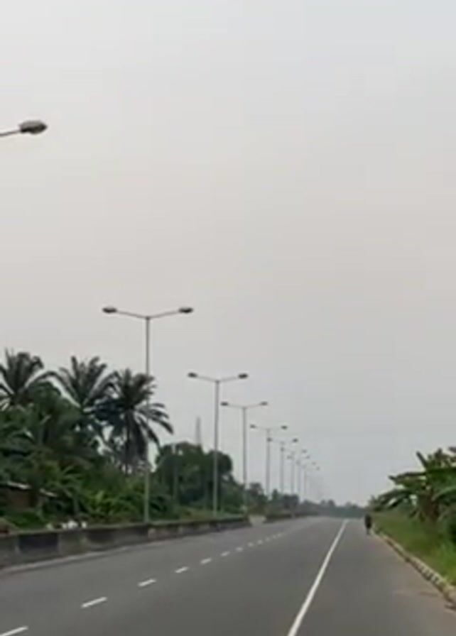 long, straight, empty highway stretching into the distance under a gray, overcast sky. The road is lined with evenly spaced streetlights. Lush, tropical vegetation, including palm trees, grows along the sides of the road. A single person walks along the shoulder of the road in the distance. The pavement is cracked and marked with white lane dividers. The overall scene suggests a somewhat remote or sparsely populated area.