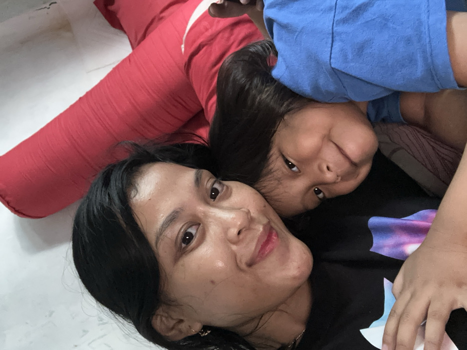 A selfie captures a woman and a young child lying down. The woman, with dark hair and tan skin, smiles directly at the camera. The child, slightly above and behind her, has dark hair and a playful expression. The child wears a blue shirt. A red pillow rests behind them. The woman wears a black top. The image is taken at a close angle, creating a personal and intimate feel. The floor is visible in the background.