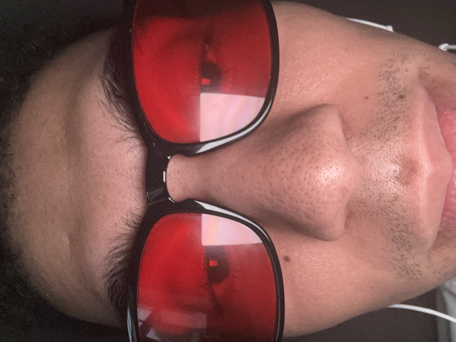 A close-up photographic portrait captures an individual, likely male, with dark skin, focusing on the upper facial area. The subject is wearing black-framed glasses with dark red, reflective lenses. Visible facial features include dark eyebrows, a prominent nose with visible pores, and nascent stubble on the upper lip and chin area. White wired earbuds are partially visible, one on the subject's right side. Reflections within the red lenses show bright, rectangular light sources, possibly a screen, with some pink/white illumination. A small, dark square is also discernible in the reflection on the left lens. The background is dark and undifferentiated, suggesting an indoor setting with obscured surroundings. The specific location within the city of London, United Kingdom, is not discernible from the visual information provided in the image.