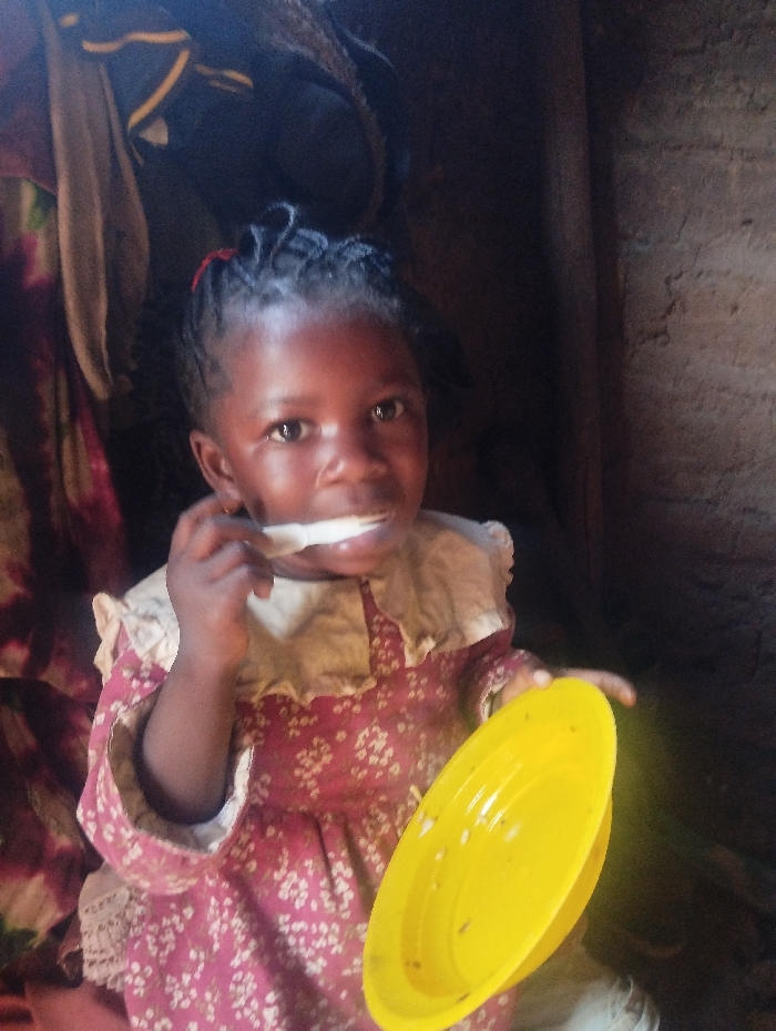A young, dark-skinned girl holds a yellow plate of food in her right hand and a spoonful in her mouth. She is adorned in a long-sleeved dress, which has a white floral pattern on red with a frilly white collar. She has braided hair and is looking at the camera. The backdrop is a dimly lit room with clothes or fabric hanging in the upper left corner. A wooden beam is visible on the right side of the frame.