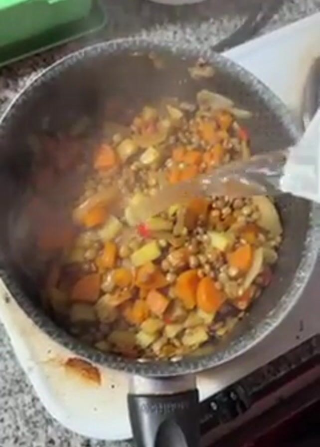 A close-up shot shows a dark gray saucepan on a white stovetop. The pan contains lentils and various diced vegetables, including carrots, potatoes, onions, and red bell peppers, simmering in a broth. Someone is pouring water into the pan from a white pitcher, creating steam. The countertop around the stovetop is speckled gray and white. A green dish rack is visible in the upper left corner, with a white object and the edge of a metal spoon visible nearby. The stove knobs are black and located on the front. The camera angle is from directly above the saucepan.