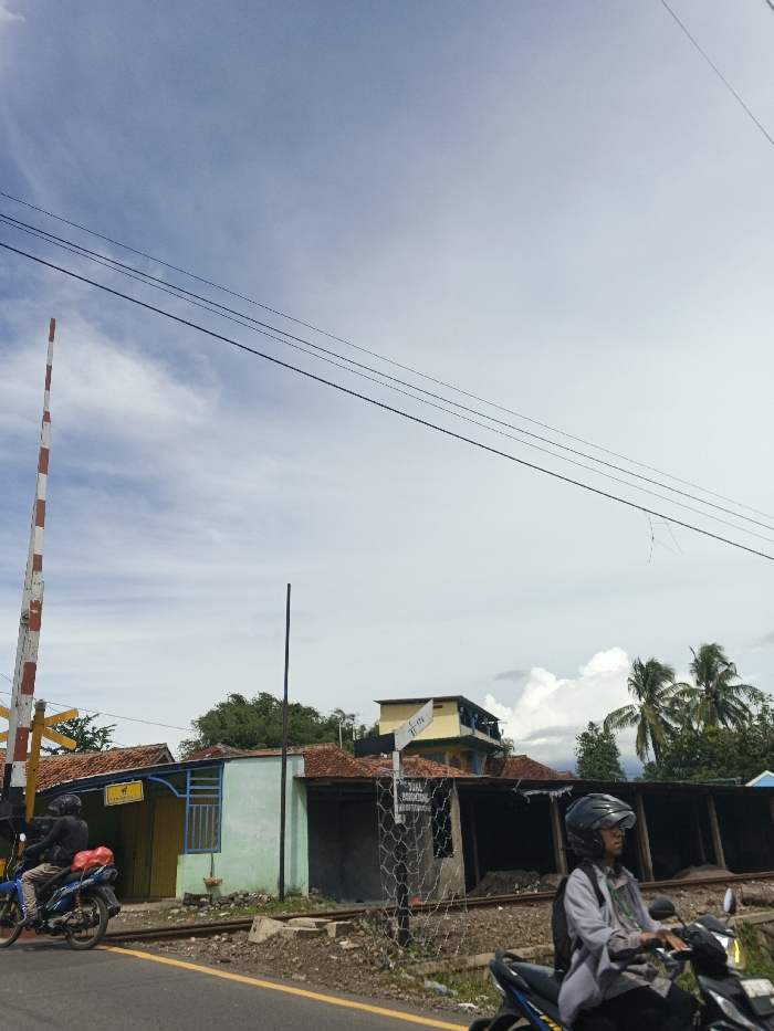 A train crossing with a striped barrier is situated beside a road. Two motorbikes with riders are present, one passing through and the other waiting. Nearby buildings have a mix of materials like wood, brick, and corrugated metal. Power lines stretch across the sky. The foliage includes trees and palm trees, indicating a tropical climate. The sky is mostly clear with scattered clouds. A small, multi-story structure is visible in the background. A small sign with numbers is visible near the center of the frame.