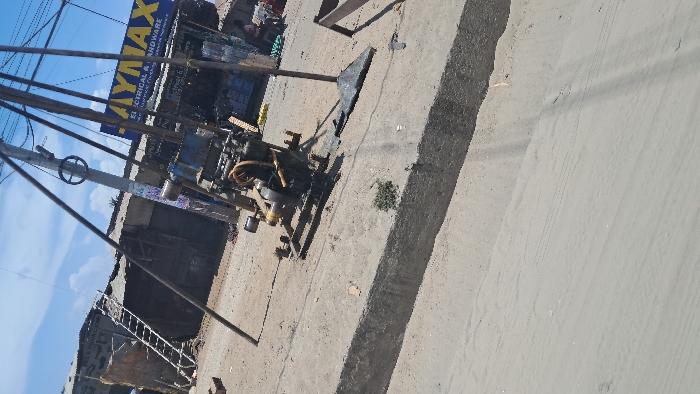 The scene depicts an outdoor urban environment in Shimo La Tewa ward, Kenya, under a clear blue sky with scattered white clouds. In the midground, a portable borewell drilling rig is positioned on a dirt and gravel surface. The rig consists of a yellow-painted engine unit, likely a diesel engine, mounted on a steel frame, with multiple black metal poles forming a tripod-like support structure. A black, triangular metal base plate lies on the ground to the rig's right. Directly behind the rig stands a utility pole with a circular attachment and overhead wires. The immediate foreground shows a light-colored, sandy or dirt surface, separated from the midground by a low, raised concrete barrier or curb. Subtle tire tracks are visible on the sandy surface. In the background, a row of single-story commercial buildings with corrugated metal roofs is present. One building features a prominent blue and yellow sign displaying "JAYMAX ELECTRICAL & HARDWARE." An aluminum extension ladder leans against the front of an adjacent building to the left. Indistinct human figures are visible near the commercial structures in the far background. No specific actions or interactions are clearly discernible.