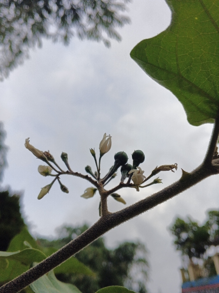 The image presents a close-up, low-angle view of a plant branch against an overcast sky in the city of Kyauk Hsoke, Myanmar. A central, textured brown stem, approximately 1 cm in diameter, runs diagonally from the lower left to the upper right. This stem features small, sharp protrusions and numerous secondary stems. Approximately 10-12 small, white to cream-colored flowers or buds are visible on these secondary stems, some in full bloom with five petals, others as closed buds, and some appearing wilted. Three prominent, dark green, spherical objects, approximately 1 cm in diameter each, are attached to short stalks on the right side of the main branch, resembling developing fruits or mature buds. A segment of a large, green leaf with visible venation occupies the upper right corner. The background consists predominantly of a uniform light grey, overcast sky. Blurred green foliage is discernible in the upper left and lower-mid sections of the background. A faint, blurred structure with horizontal blue and red stripes is partially visible in the lower right background. No people, actions, or interactions are present.