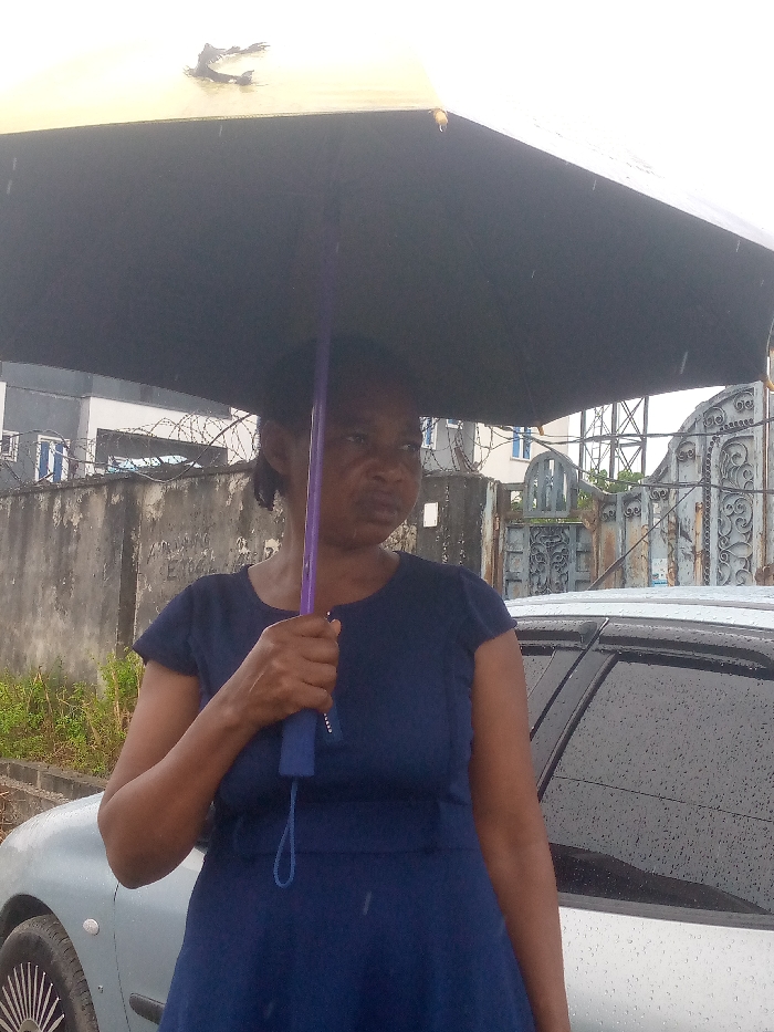 In Iranla, Nigeria, an adult female subject with dark complexion and dark hair is depicted outdoors, holding an open umbrella. She wears a navy blue, short-sleeved dress. Her right hand grips the blue handle of the umbrella, which has a purple shaft and a dark canopy with a visible yellow-gold upper surface. Raindrops are evident on the umbrella and on the visible portion of a light-colored vehicle, possibly a silver sedan, positioned behind and to her right. The background includes a weathered concrete wall topped with razor wire, a multi-story building behind the wall, and an ornate metal gate to the right. The sky is overcast. Sparse vegetation is visible in the lower left foreground.