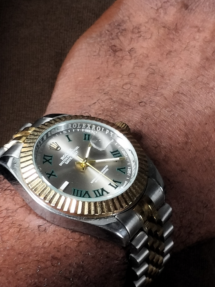 A close-up depicts a wrist adorned with a watch. The watch face is silver with gold accents and features Roman numeral hour markers in green. The name "ROLEXROLPY" is printed along the top of the watch face. The watch band is two-toned, alternating between silver and gold links. The arm displays signs of hair.