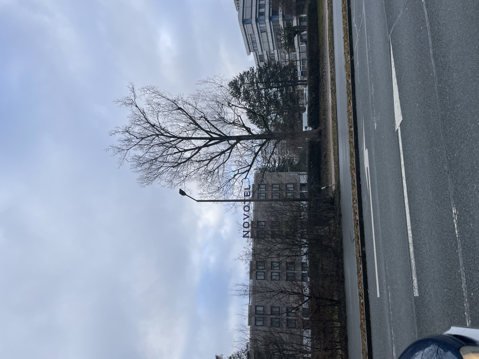 The image presents an outdoor urban scene on a cloudy, possibly overcast, day, indicative of late autumn or winter conditions. The location is Willy-Brandt-Straße in Nuremberg, Germany. In the immediate foreground, the partial hood and fender of a dark blue vehicle are visible in the lower-left corner, suggesting the photograph was taken from within or immediately adjacent to a car. The foreground is dominated by a wet, dark asphalt road, featuring white dashed lane lines and a large white arrow indicating forward movement. A dark curb separates the road from a narrow, reddish-brown paved strip, likely a sidewalk or bicycle path, which shows scattered dark leaves. The midground features a line of bare deciduous bushes and smaller trees, behind which stands a prominent five-to-six-story grey building. Large dark letters spelling "NOVOTEL" are mounted on the building's roofline. The structure has a repetitive pattern of rectangular windows. To the left of a large, centrally located bare deciduous tree, a tall, dark streetlamp with a single light fixture is visible. To the right of the large tree, a cluster of evergreen trees and a dark green hedge are present. Further to the right, a modern, multi-story building with a lighter facade and numerous horizontal window bands is partially visible. The background consists of an overcast sky with varying shades of light grey and white clouds. No individuals or specific actions are discernible within the frame. The overall environment appears damp.