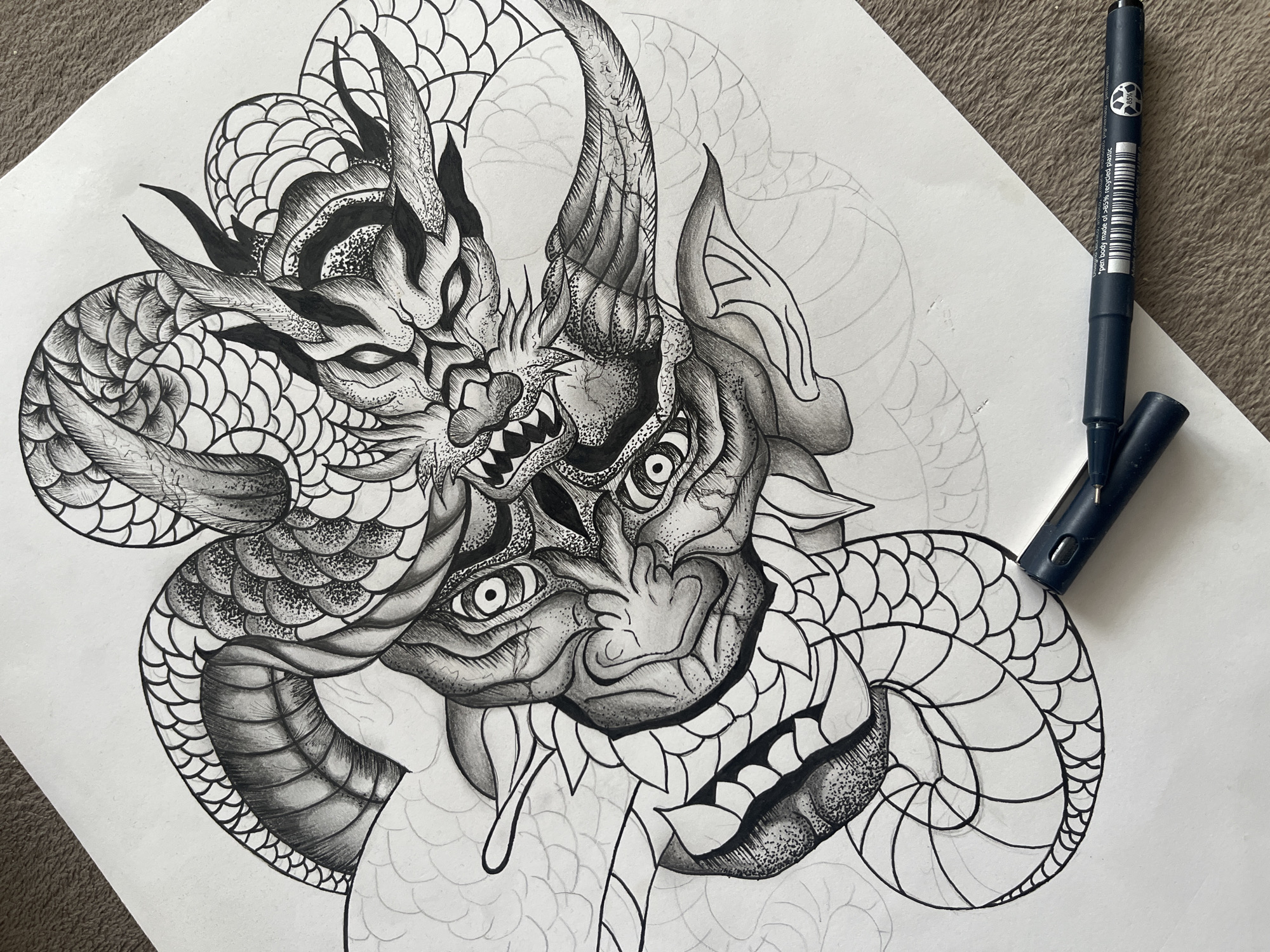 An overhead view displays a detailed, partially completed black ink drawing on white paper, resting on a textured brownish-grey surface. The artwork features a complex Japanese Irezumi-style design, prominently depicting a dragon head with sharp teeth, horns, and intricate scales. This dragon figure is intertwined with or positioned above a stylized, grimacing Oni-like mask, which exhibits large, wide-open eyes and textured skin. The dragon's body, characterized by serpentine forms and scaled segments, extends around the central figures. Key sections of the dragon's head and the Oni mask are fully rendered with black ink using stippling, cross-hatching, and solid fills, while other parts of the dragon's body and mask are outlined in black or remain as faint pencil sketches, indicating work in progress. A dark blue fineliner pen, with its cap removed, lies on the lower right portion of the paper, pointing towards the unshaded areas of the drawing. Text on the pen barrel states "pen body made of >85% recycled plastic." The scene is located in Sofia, Bulgaria.