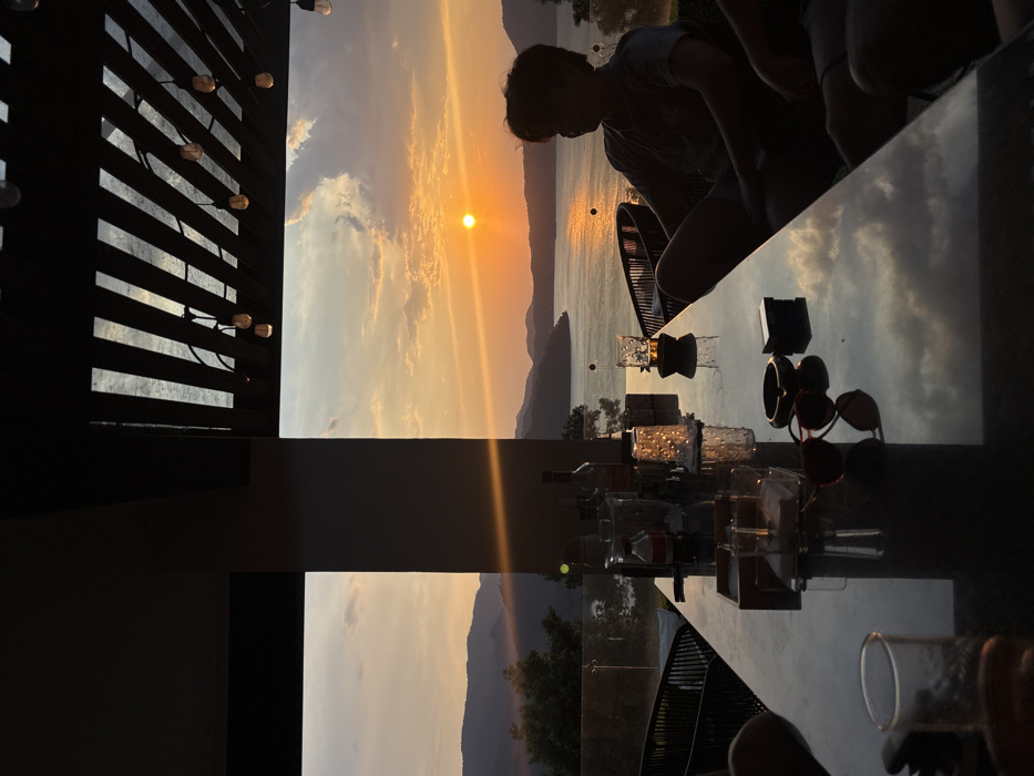 The image captures a sunset scene over Lake Avándaro in Valle de Bravo, Mexico, viewed from an elevated, semi-outdoor terrace. The sun, a bright orange disc, is positioned above the horizon over the lake, casting an intense orange glow across the water and sky. Distant mountains frame the lake on both sides. The terrace structure includes a dark, vertical architectural pillar on the left side of the frame and a slatted pergola ceiling with multiple strung Edison-style lights visible overhead. A glass railing borders the viewing area. In the foreground, a dark, reflective rectangular table is set, reflecting the colors of the sunset and clouds. Various objects are arranged on the table: several clear drinking glasses, some appearing used, a red-labeled bottle (likely a soft drink), at least two dark liquor bottles, an ice bucket, a small lit candle in a glass holder, a dark ashtray containing a cigarette butt, a white box (likely a cigarette pack), a pair of red-framed sunglasses, and a wooden tray. Two individuals are present at the table. On the right, a person with dark, medium-length hair, wearing a t-shirt and shorts, is seated in a dark chair, silhouetted against the sunset, looking towards the lake. Their right leg is crossed over their left. The left arm and a clear glass belonging to a second, unseen person are partially visible in the bottom left corner of the frame. The immediate foreground and interior elements are underexposed, emphasizing the bright sunset in the background.