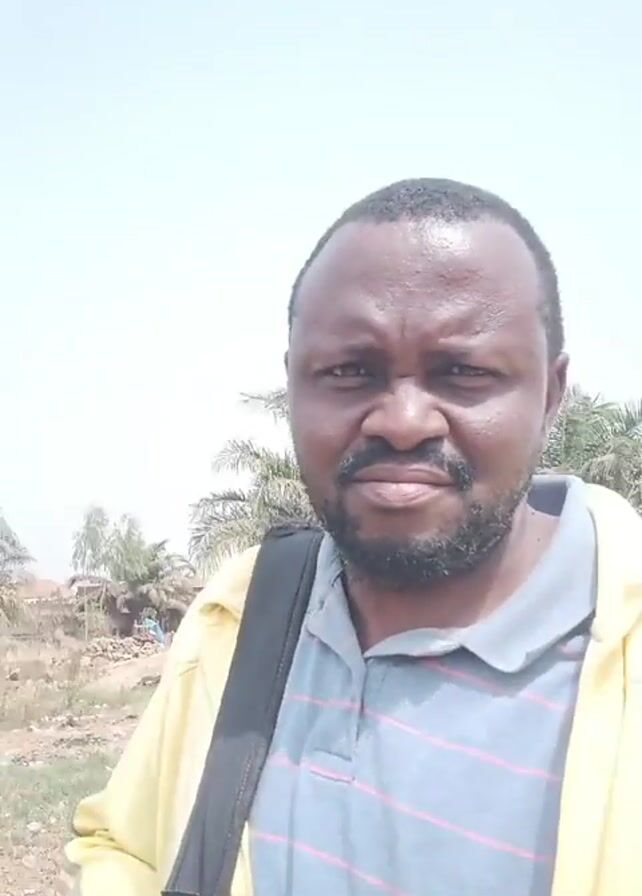 A man with dark skin, a beard, and short hair stands facing the camera. He is wearing a gray polo shirt with horizontal pink stripes and a yellow jacket. A black backpack strap is visible over his left shoulder. Behind him is a dry, grassy field with scattered debris and a few palm trees. In the background, there are some simple structures. The sky is light and appears overcast.