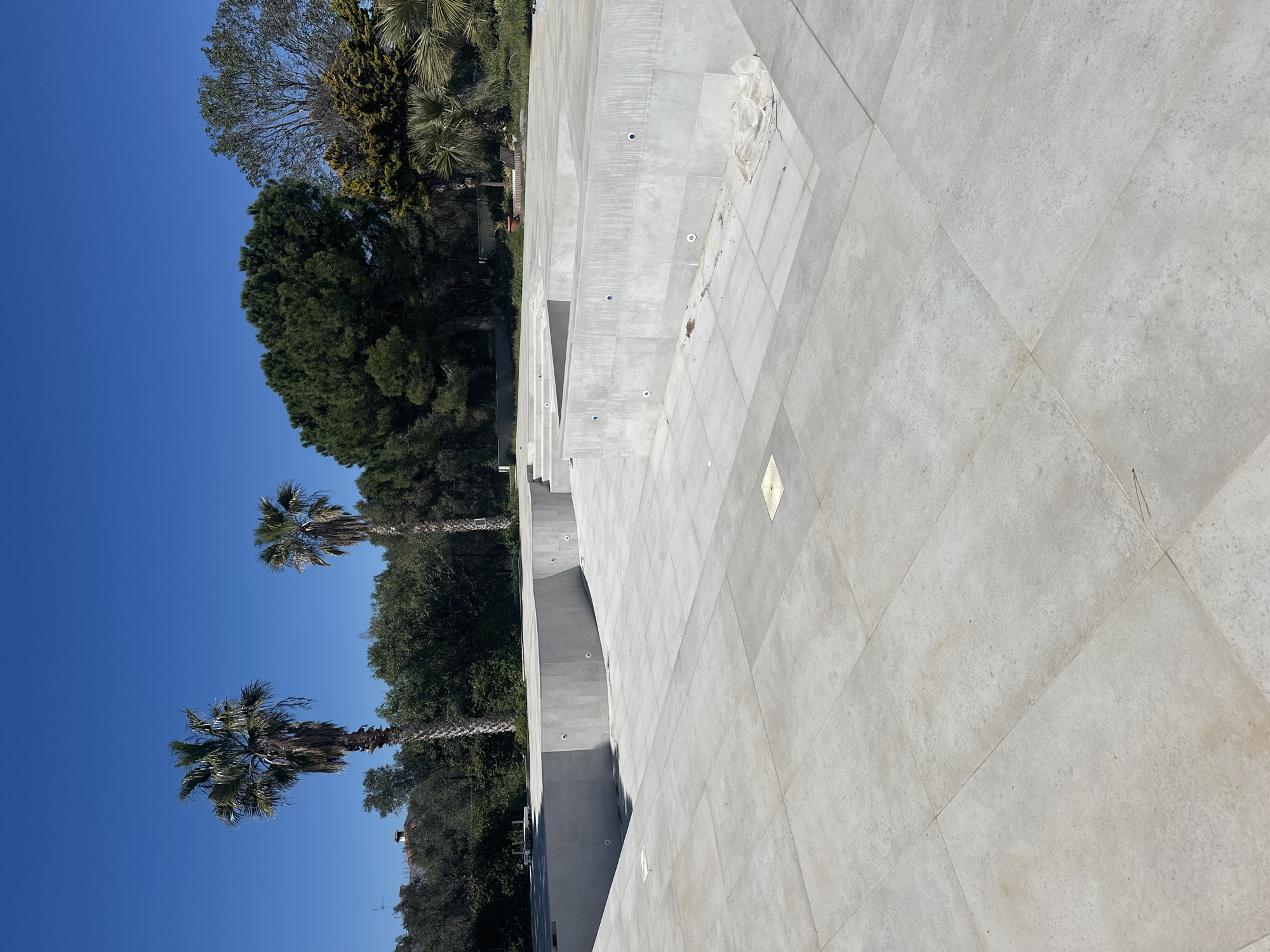 portion of a building with tiled flooring in Unknown, Greece. The building features a series of arches or recessed sections. Palm trees are visible along the edge of the building against a clear blue sky. The tiled surface has a light gray color and a textured appearance. Some rectangular shapes are present on the tiling pattern of the tiles. The building is surrounded by other trees and plants.