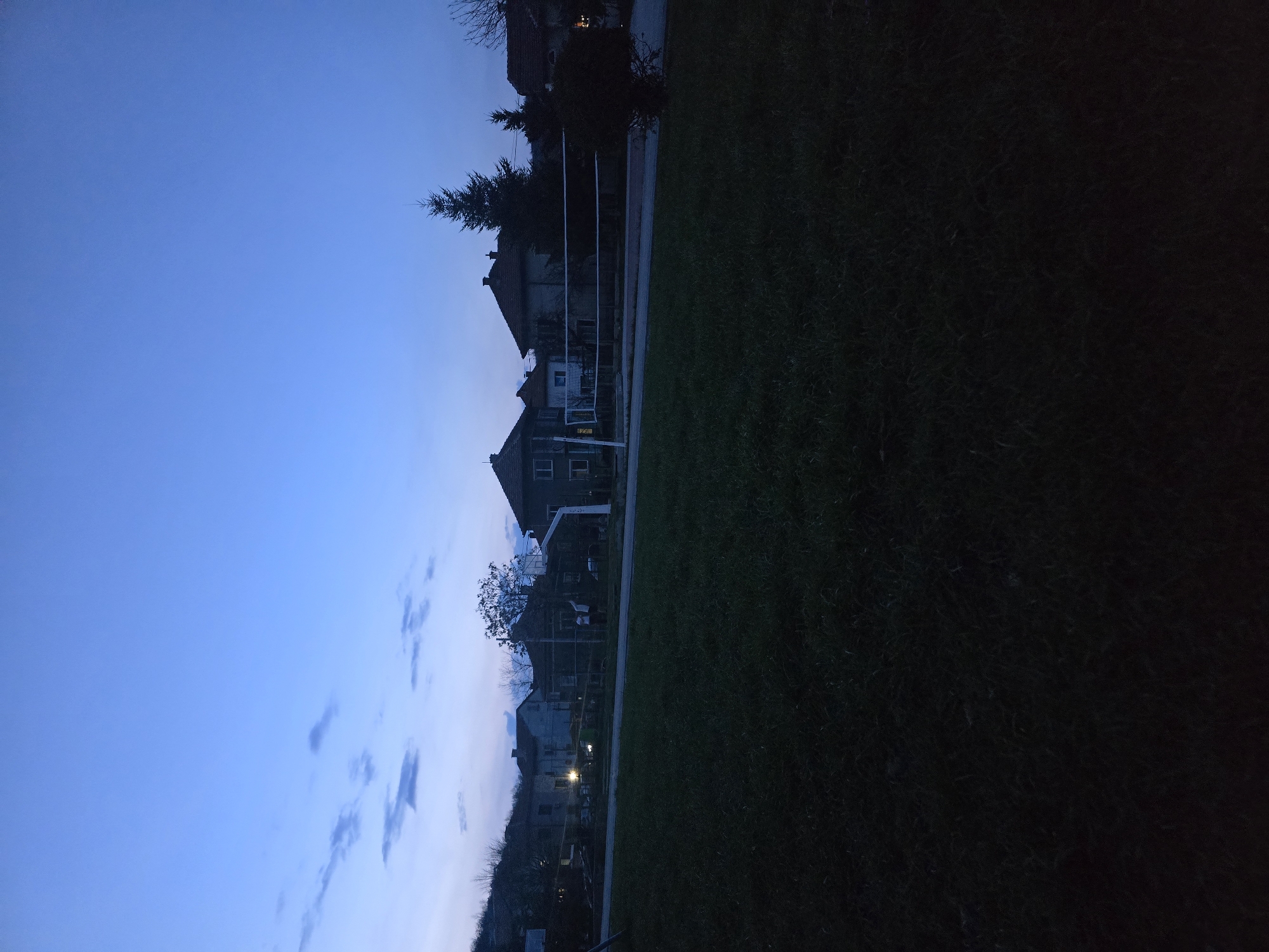 The image depicts an outdoor scene in Berkovitsa, Bulgaria, at twilight. The sky dominates the upper portion, exhibiting a deep blue hue transitioning to lighter blue-grey towards the horizon, with sparse, indistinct dark clouds primarily in the upper left quadrant. The lower half of the frame is occupied by an expanse of dark green grass, indicative of a field or park area. In the midground, from left to right, a white basketball hoop with a backboard is visible. Slightly to its right, two human figures are faintly discernible near what appears to be another basketball setup or goal, positioned in front of residential structures. The figures are wearing light-colored clothing. Behind these elements, several residential houses with dark roofs and lighter facades are present; one house on the left emits a bright internal light. Further right in the midground, a white volleyball net spans across the scene, supported by poles. Behind the net are more residential houses and a prominent, tall, dark coniferous tree. Another house on the far right displays a lit window. Bare-branched deciduous trees are also scattered throughout the midground. Faint outlines of hills or mountains are visible on the horizon to the far left. The overall lighting conditions suggest dusk or early nightfall.