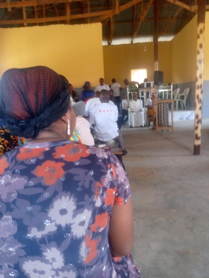 The scene depicts an indoor gathering within a large, open room in the city of Unknown, Unknown. The room features a high ceiling with exposed wooden rafters supporting a corrugated metal roof, yellow-painted walls, and a light gray concrete floor. A prominent pillar with a brown and black mottled pattern is located in the mid-right. In the immediate foreground, the back of a female subject's head and upper torso are visible. She wears a dark blue/purple short-sleeved top adorned with orange, light purple, and white floral patterns, accented by small silver elements. Her dark hair is covered by a black, mesh-like fabric, and she has a silver dangle earring on her right ear. Approximately 15-20 individuals are visible in the midground and background, primarily seated on wooden benches. Several male subjects wear identical white t-shirts with the acronym "NKST" printed in red on the back. At the rear of the room is a raised platform, covered along its base with blue and white patterned material. On the platform, a male subject in a long white robe is seated, positioned next to a small drum. A light-colored wooden pulpit or stand and a dark speaker on a stand are also present on the platform. White plastic chairs are stacked to the right on the platform. A window in the yellow back wall behind the platform provides natural light. The gathered individuals are oriented towards the platform.
