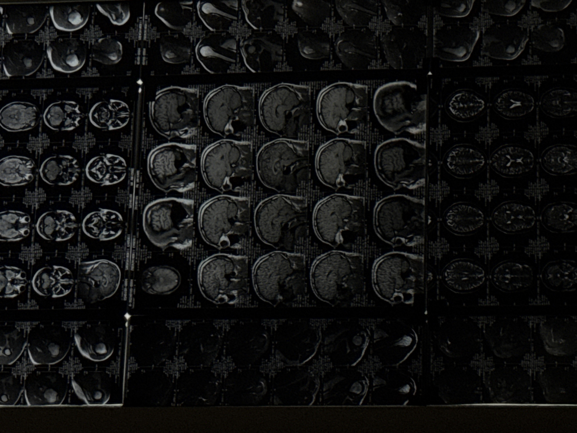 The image displays a vertical array of backlit medical imaging films, primarily MRI scans, arranged in a grid
