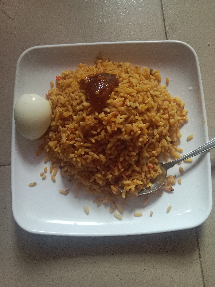 A white rectangular plate, containing a meal, is centered in the frame, resting on a light brown tiled surface in the City of Unknown, Unknown. The plate holds a large portion of orange-red jollof rice, with individual grains visible. A small, dark reddish-brown, glossy stew or sauce is positioned centrally on top of the rice. To the left of the rice, a peeled white hard-boiled egg is present. A silver-colored metal spoon with a reflective bowl is partially submerged in the rice on the right side of the plate, its handle extending out of view. The tiled surface exhibits visible grout lines and a subtle texture. No individuals are depicted in the scene.