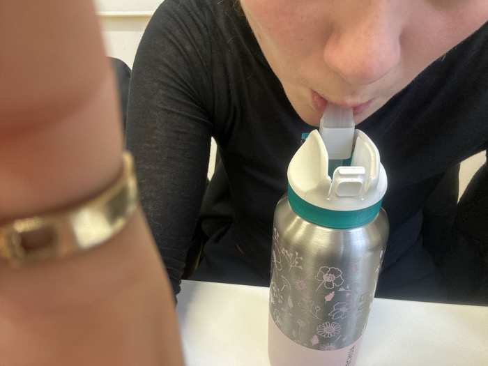 An indoor scene, likely captured from a first-person perspective, depicts a person drinking from a metal water bottle