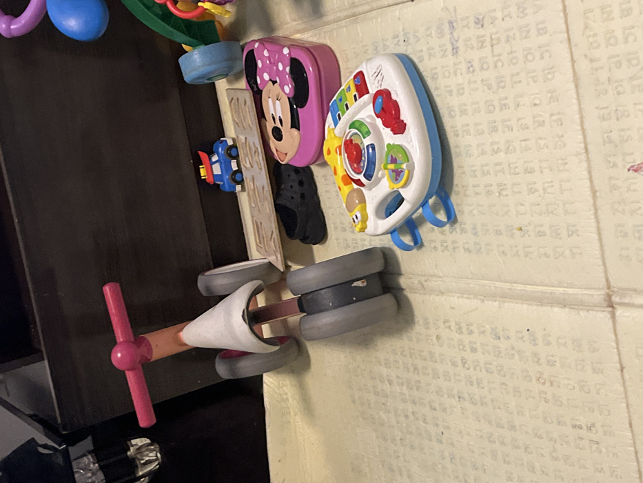 collection of colorful children's toys scattered on what appears to be a cardboard surface with printed text. There's a pink Minnie Mouse container, a blue toy car, and an interactive activity center with various buttons and sounds. A small pink and wooden tricycle is visible as well. The composition is slightly angled, with a dark wooden surface partially visible in the background. The overall impression is that of a child's play area.